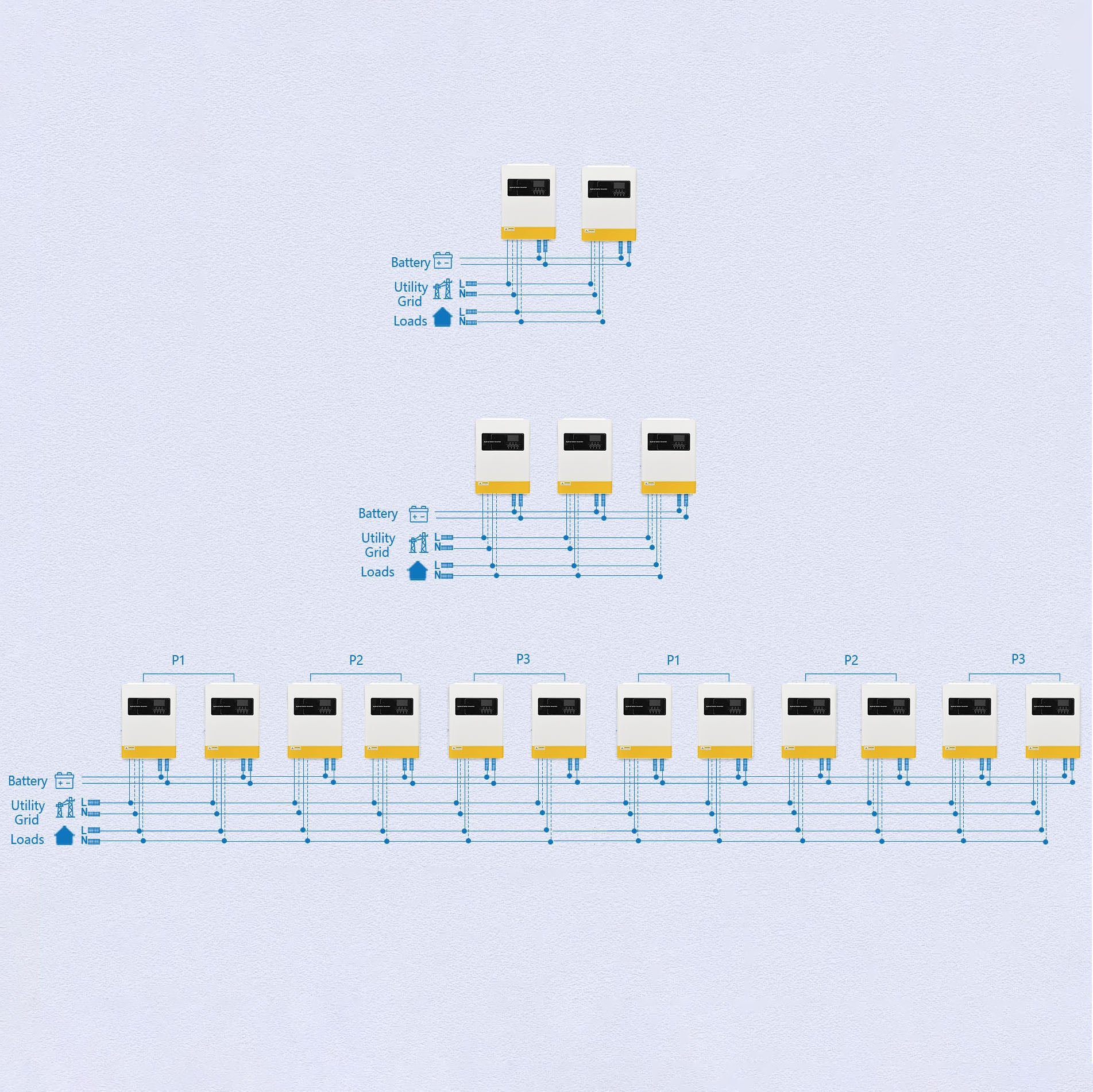 The 3000W solar inverter charger allows for the simultaneous connection of up to 12 units, providing a total power output of up to 36,000W. This scalability makes it suitable for various applications, including residential, office, commercial, and industrial use. With its dependable and efficient design, this solar inverter charger is the perfect choice for extensive solar systems, supporting Single/Split/Three Phase Output